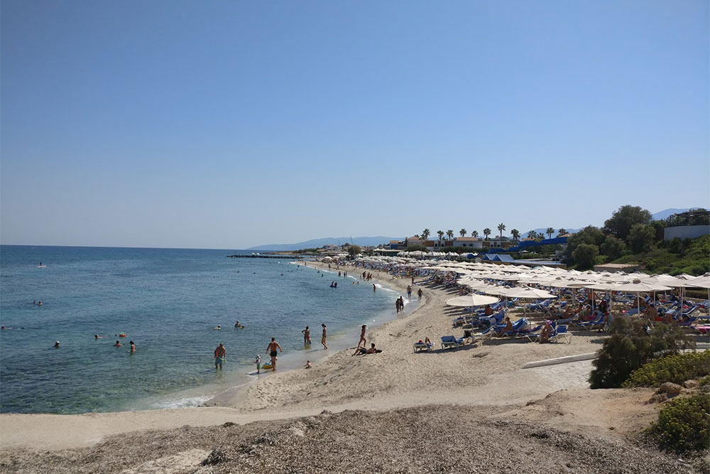 East of the church stretches the main beach of Analipsis, a large sandy beach with umbrellas and loungers West of the church the coast is rocky. Few people go swimming there, unless they want to enjoy the peace and quiet or a pleasant walk under the tamarisk trees. If you like fishing from the shore, the rocks are the best place for your sport. Continuing west, you come to a small, sandy cove, ideal for when the wind is blowing and the sea off the other beaches is rough. At the end of the road is yet another sandy beach, at the mouth of the River Aposelemis, with a few ducks waddling about and attracting the attention of visitors.