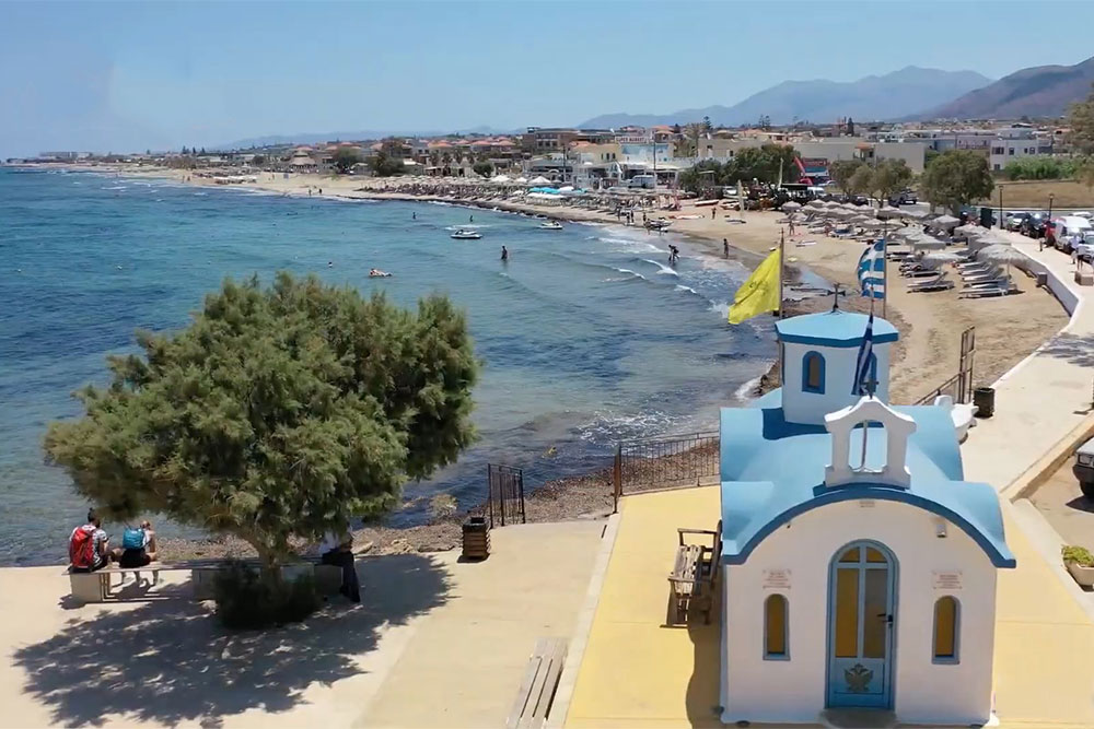 Analipsis is roughly 24 kilometres east of Heraklion, shortly after Gouves and before Anissaras. It is also known as Analipsis Hersonissou, as it is very close to the seaside resort of Hersonissos. Analipsis is built along a long road, running over a kilometre from the old Heraklion - Agios Nikolaos National Road down to the beach. Analipsis differs from the neighboring seaside resorts in that tourist development began much later here. This gives you the impression, on entering Analipsis that you are in a verdant Cretan village with houses and pretty gardens alternating with fields and olive groves. Of course, as you near the centre of the village and the beach, there are more and more car rental bureaus, restaurants and other tourist businesses. You will also see estate agencies, showing that there is considerable interest in buying land and houses in the area, which is still being built up. On reaching the beach of Analipsis, the first thing you see is the tiny church with the waves almost lapping at its foot. It is a very picturesque church and every tourist who passes through Analipsis stops here for a commemorative photo.